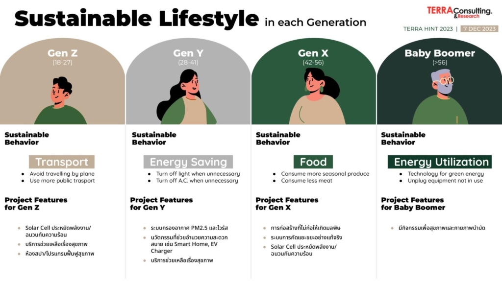 The research also found that the Sustainable Lifestyles of each group of people have different behaviors, with Gen Z (ages 18-27) being a group that cares about traveling. Most of them emphasize the use of public transportation. Gen Y (aged 28-41) is more concerned with energy, such as turning lights on and off when not needed. Gen X (aged 46-56) is People who are interested in food and health, such as reducing eating meat. Or eat seasonal vegetables and the Baby Boomer group (over 56 years old) is a very interesting group. Because this group of people turns to pay more attention to green technology such as solar cells.
