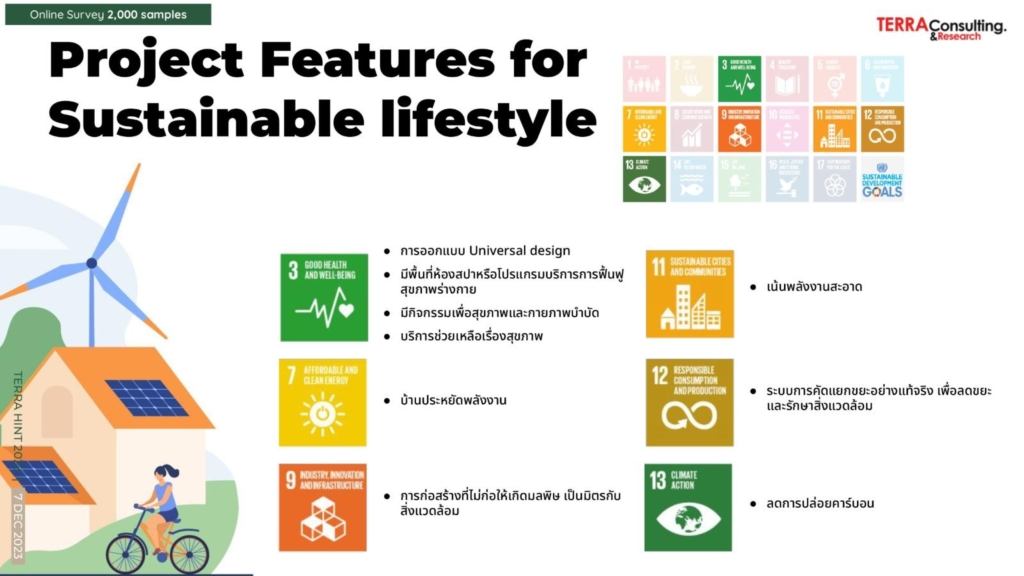 Ms. Sumitra Wongpakdee, Managing Director of Terra Media and Consulting Company Limited or TERRA BKK said that from the research results of The most powerful of real estate brand 2023 and in-depth look at consumer behavior according to the concept of Well-Being and Sustainable Lifestyle. From a questionnaire with a sample of 2,000 people, it was found that more than 42% of respondents planned to buy a home in the next 3 years, with most wanting to buy single-detached houses and townhomes. At the price level from 3 – 7 million baht